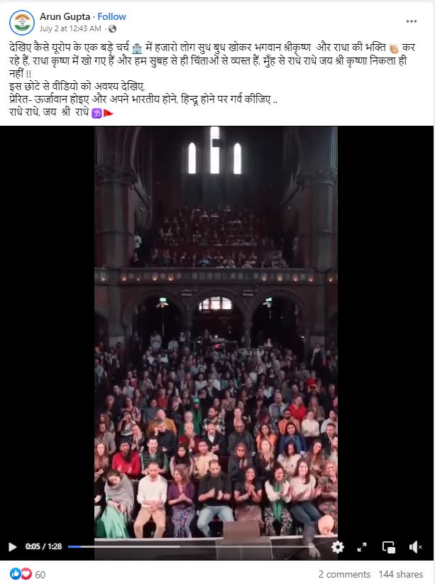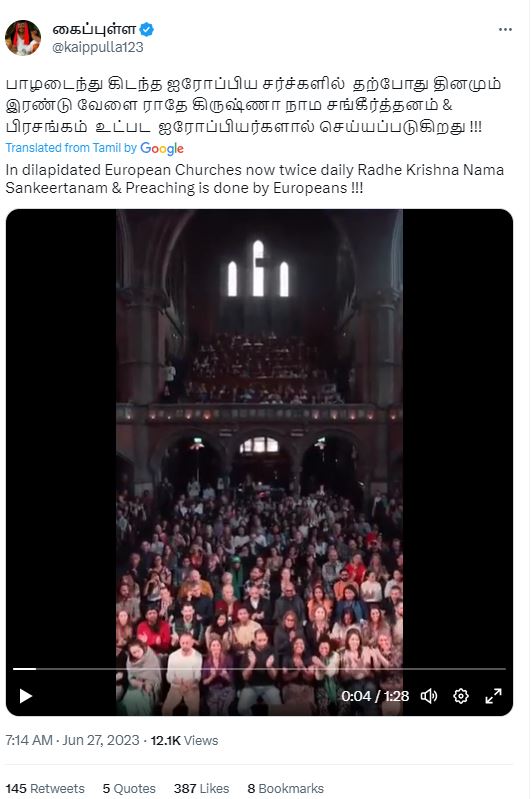 सोशल मीडिया पर एक वीडियो वायरल है, जिसमें एक समूह में लोग कीर्तन करते नज़र आ रहे हैं। वीडियो को शेयर कर दावा किया जा रहा है कि यूरोप के एक बड़े चर्च में हजारों लोग सुध बुध खोकर भगवान श्रीकृष्ण और राधा की भक्ति कर रहे हैं। तमिल भाषा में किए गए ट्वीट में दावा किया गया है कि यूरोपीय चर्च में अब दिन में दो बार राधे कृष्ण का नाम और उपदेश यूरोपीय लोगों द्वारा लिया जाता है।