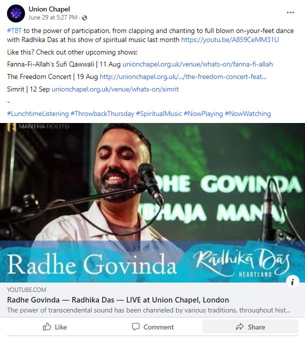 इसके अलावा Union Chapel के फेसबुक पेज पर 29 जून का एक पोस्ट मिला। इसमें मई में हुए राधिका दास के परफॉर्मेंस के बारे में बताया गया है। साथ में अमेरिकन कैनेडियन बैंड फन्ना-फि-अल्लाह की सूफी कव्वाली के 11 अगस्त को होने वाले कार्यक्रम का भी जिक्र है।