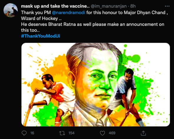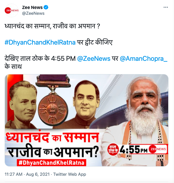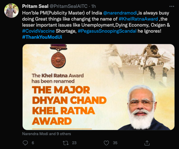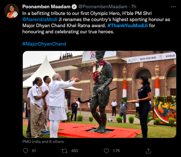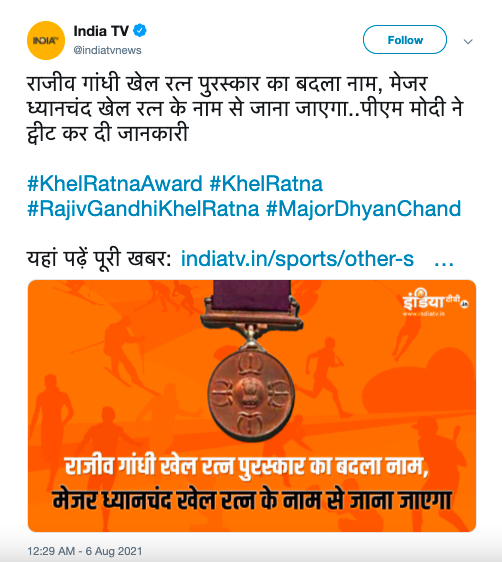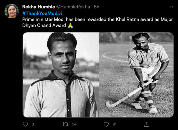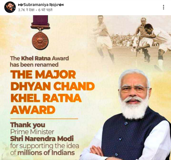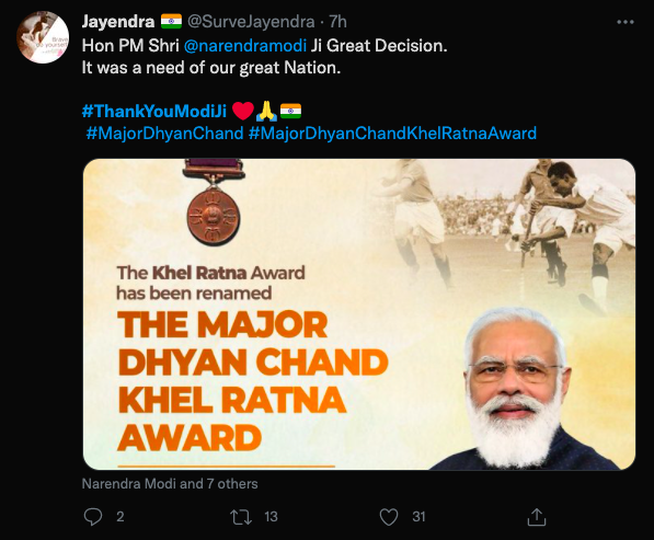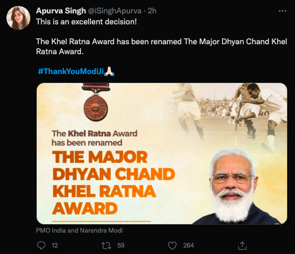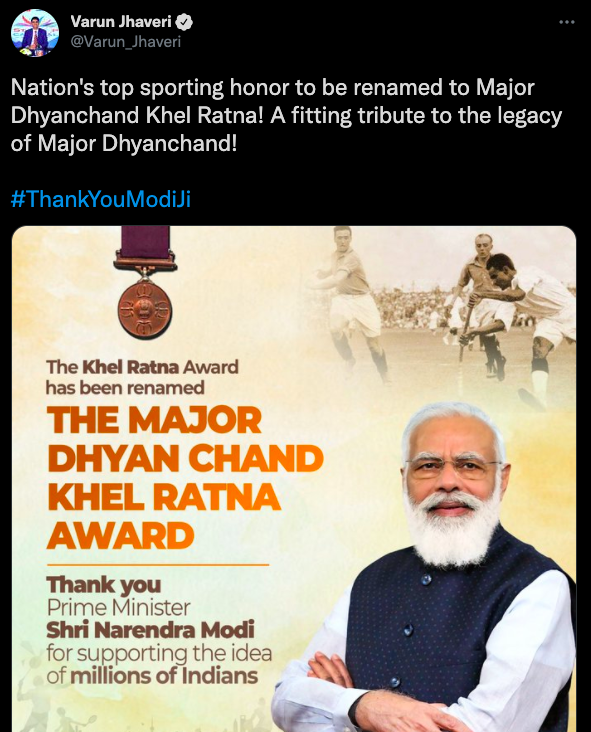 किसी ने इस पोस्टर पर खेल रत्न की जगह परम वीर चक्र की तस्वीर लगा दी और उत्साह में यही पोस्टर कई लोगों ने पोस्ट भी कर दिया। इसे कई वेरिफाइड हैंडल द्वारा भी शेयर किया गया जिनमें बीजेपी के प्रवक्ता संबित पात्रा भी शामिल थे।