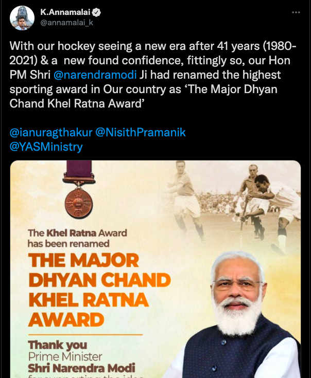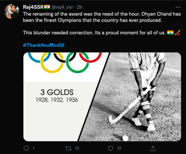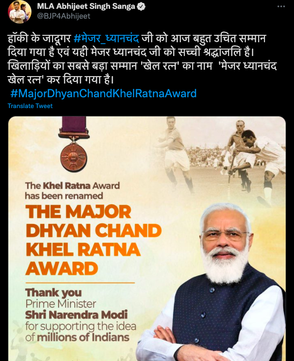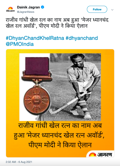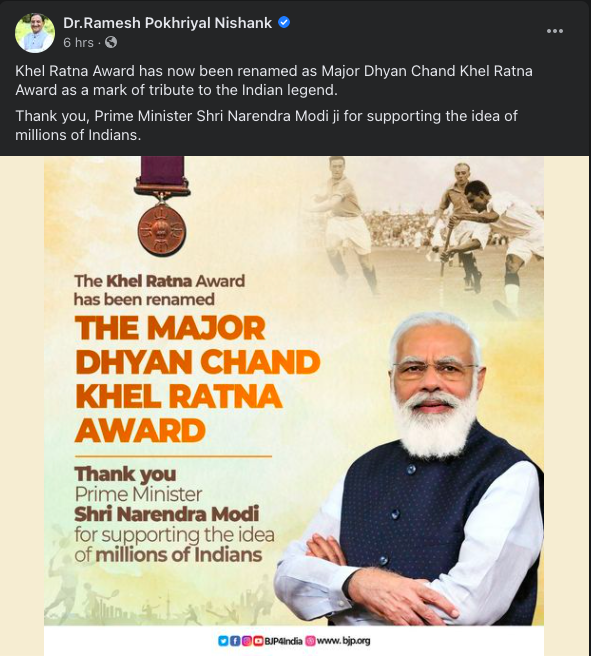 प्रधानमंत्री नरेंद्र मोदी ने राजीव गांधी खेल रत्न पुरस्कार का नाम बदलकर मेजर ध्यानचंद खेल रत्न किए जाने की घोषणा की है। पीएम ने अपने ट्विटर अकाउंट से लिखा कि खेल जगत के इस प्रतिष्ठित पुरस्कार का नाम बदले जाने की मांग पिछले कई समय से की जा रही थी। इस घोषणा के बाद से ही सोशल मीडिया पर #thankyoumodiji ट्रेंड करने लगा।