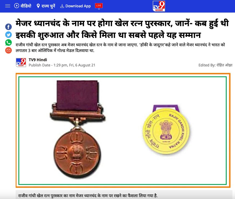 Google Reverse Image Search के नतीजे बताते हैं कि परम वीर चक्र को कई न्यूज़ मीडिया पोर्टल द्वारा भी खेल रत्न की जगह इस्तेमाल किया गया।