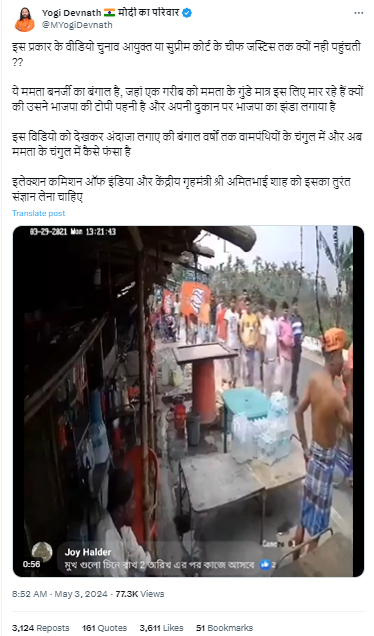31 मार्च 2021 को टाइम्स नाउ की रिपोर्ट में बताया गया है कि यह वीडियो दुकान के सीसीटीवी फुटेज से ली गयी है। दुकान पर भाजपा के चुनाव चिन्ह कमल के साथ एक झंडा लगाया गया था और दुकान के अंदर बैठे व्यक्ति ने भगवा रंग की टोपी पहनी हुई थी। दुकान के पास से गुज़र रहे लोगों का एक समूह इस बात से नाराज़ होकर उस व्यक्ति की पिटाई करने लगता हैं।