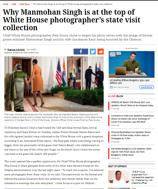पड़ताल के दौरान, हमें 22 अक्टूबर 2016 को Indian Express द्वारा प्रकाशित की गई रिपोर्ट मिली। इस रिपोर्ट के मुताबिक, ओबामा ने व्हाइट हाउस में अपने कार्यकाल का आखिरी भोज, इटली के प्रधानमंत्री और उनकी पत्नी के लिए दिया था। इस दौरान, भारत के पूर्व प्रधानमंत्री मनमोहन सिंह और उनकी पत्नी भी वहां पहुंचे थे। व्हाइट हाउस के फोटोग्राफर पिट सौजा ने उस समारोह की एक फोटो सीरीज बनाई थी, जिसमें व्हाइट हाउस में आमंत्रित मेहमानों की तस्वीरों को कैमरे में कैद किया गया था। फोटो की सीरीज में, मनमोहन सिंह और उनकी पत्नी के स्वागत की तस्वीर को प्रथम स्थान दिया गया था। इस सीरीज में दुनिया के अन्य देशों के प्रमुखों की तस्वीरें भी मौजूद थीं। लेकिन हमें इस रिपोर्ट में वायरल हुए दावे से सम्बंधित कोई जानकारी नहीं मिली।