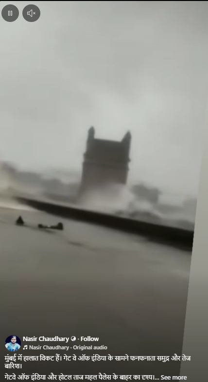 मुंबई के गेटवे ऑफ़ इंडिया पर बाढ़ और टकराते पानी की तेज लहरों का एक वीडियो इस दावे से शेयर किया जा रहा है कि यह मुंबई में हुई हालिया बारिश के दृश्य हैं.