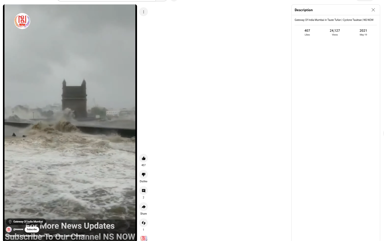 मुंबई के गेटवे ऑफ़ इंडिया पर बाढ़ आने के दावे से वायरल इस वीडियो की पड़ताल में हमें कीफ्रेम की मदद से रिवर्स इमेज सर्च करने पर यह वीडियो NS NOW नाम के यूट्यूब अकाउंट से 19 मई 2021 को अपलोड किया हुआ मिला. वीडियो के साथ मौजूद कैप्शन में इसे 2021 में आए तौकते तूफ़ान का बताया गया था.