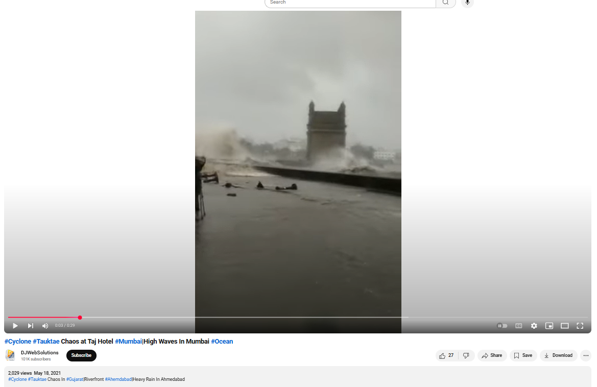 इसके अलावा हमें यह वीडियो एक अन्य यूट्यूब अकाउंट से भी 18 मई 2021 को अपलोड किया हुआ मिला. इस वीडियो के साथ मौजूद टाइटल में भी इसे 2021 में आए तौकते तूफ़ान का ही बताया गया था. पाठकों की जानकारी के लिए बताते चलें कि मई 2021 में तौकते तूफ़ान आया था. इसका असर कई दक्षिण भारतीय राज्यों कर्नाटक, केरल समेत गुजरात और महाराष्ट्र पर भी पड़ा था.