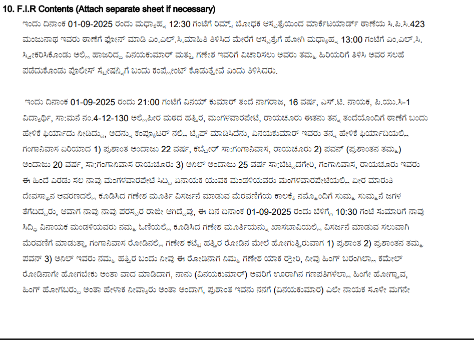 एफआईआर में बताया गया था कि यह घटना 1 सितंबर 2025 को सुबह रायचूर के गंगा निवास रोड पर हुई थी, जब एक पक्ष उस इलाके से गणेश प्रतिमा को विसर्जन के लिए ले जा रहा था. तभी दूसरे पक्ष के प्रशांत, पवन और अनिल ने इसका विरोध किया. इसी दौरान प्रशांत और पवन पास की एक दुकान की छत पर चढ़ गए और यात्रा पर पत्थर फेंकने लगे. इस दौरान दो लोग जख्मी भी हो गए. जख्मी होने के बाद दोनों को इलाज के लिए रिम्स में भर्ती कराया गया था. एफआईआर में मौजूद नामों के अनुसार, दोनों पक्षों के लोग हिंदू ही हैं. हालांकि, पीड़ित के नाबालिग होने के कारण हम उसका नाम यहां नहीं लिख रहे हैं.