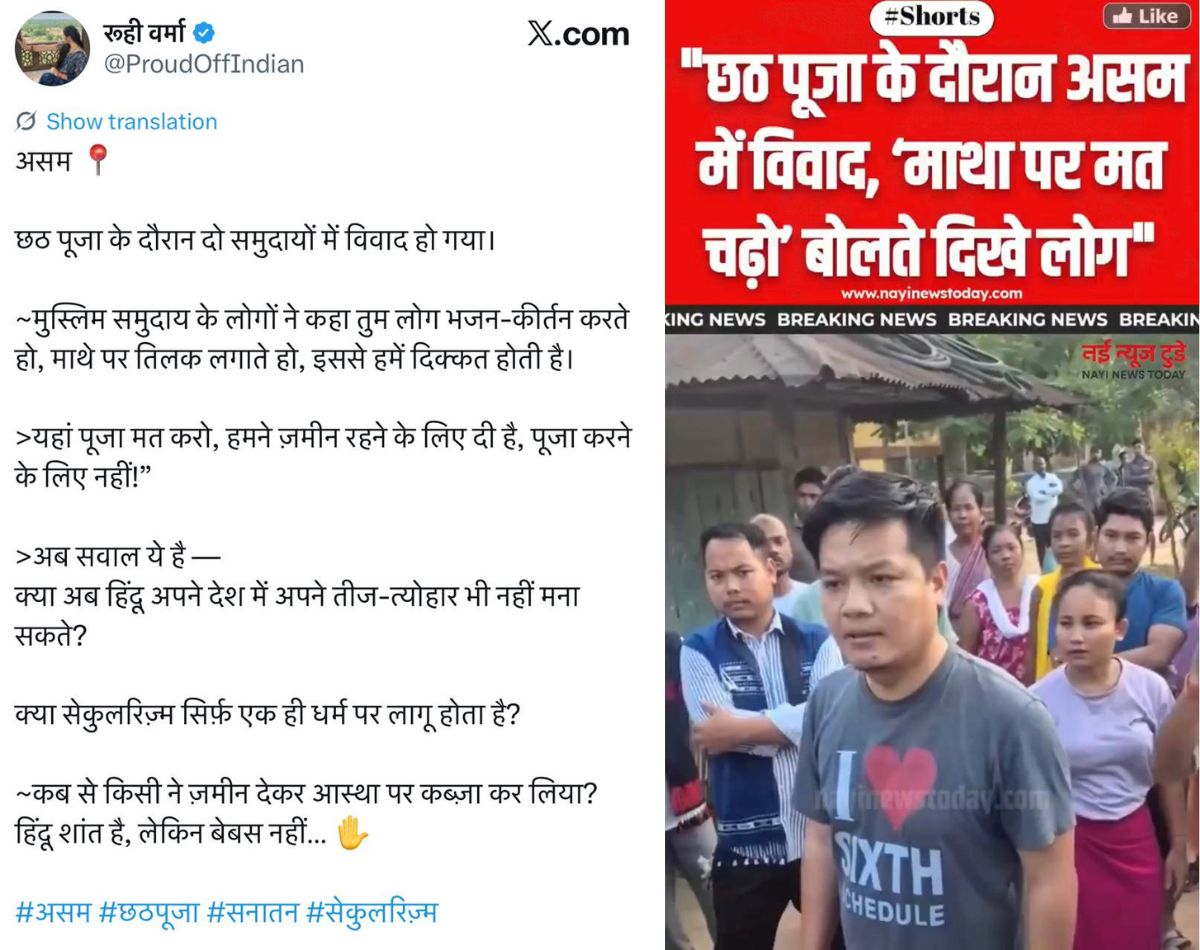 एक्स पर एक यूज़र ने वीडियो पोस्ट करते हुए लिखा, “असम 📍 छठ पूजा के दौरान दो समुदायों में विवाद हो गया। मुस्लिम समुदाय के लोगों ने कहा तुम लोग भजन-कीर्तन करते हो, माथे पर तिलक लगाते हो, इससे हमें दिक्कत होती है। यहां पूजा मत करो, हमने ज़मीन रहने के लिए दी है, पूजा करने के लिए नहीं!” अब सवाल ये है — क्या अब हिंदू अपने देश में अपने तीज-त्योहार भी नहीं मना सकते? क्या सेकुलरिज़्म सिर्फ़ एक ही धर्म पर लागू होता है? कब से किसी ने ज़मीन देकर आस्था पर कब्ज़ा कर लिया? हिंदू शांत है, लेकिन बेबस नहीं… #असम #छठपूजा #सनातन #सेकुलरिज़्म.” पोस्ट का आर्काइव लिंक यहां देखें.