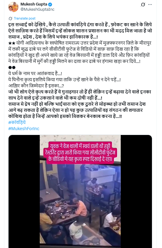 सोशल मीडिया पर एक दावा काफी वायरल हो रहा है, जिसमें कहा जा रहा है कि मुजफ्फरनगर में खाने का बिल भरने से बचने के लिए कांवड़ियों ने खुद ही वेज बिरयानी की प्लेट में हड्डी डाल कर हंगामा मचा दिया.