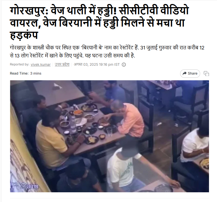 रिपोर्ट में बताया गया था कि यह घटना 31 जुलाई को गोरखपुर के बिरयानी बे रेस्टोरेंट की है. जहां 12-13 लोग खाना खाने आए थे और उन लोगों ने वेज और नॉन वेज दोनों भोजन ऑर्डर किया. इसी दौरान एक व्यक्ति ने अपने वेज खाने में हड्डी मिलने की शिकायत करते हुए हंगामा करना शुरू कर दिया. बाद में पुलिस बुलाकर उन लोगों को बाहर निकाला गया. इसके बाद रेस्टोरेंट के मालिक ने वायरल CCTV फुटेज जारी कर यह दावा किया इन लोगों में से ही एक युवक ने मंचूरियन खा रहे अपने दोस्त को हड्डी का टुकड़ा पकड़ाया था.