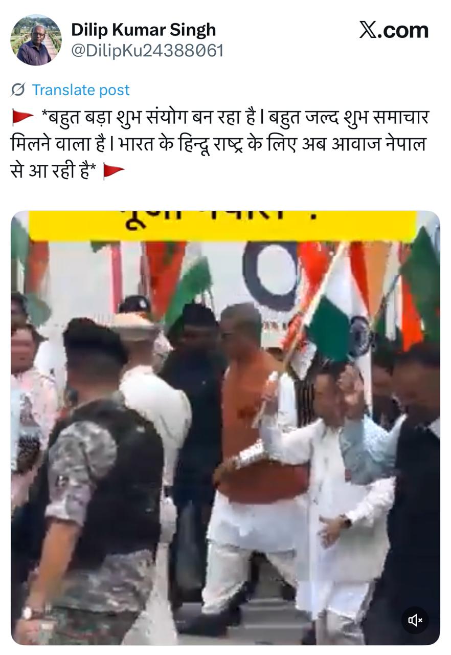 एक्स पर एक यूज़र ने वीडियो पोस्ट करते हुए लिखा, “बहुत बड़ा शुभ संयोग बन रहा है बहुत जल्द शुभ समाचार मिलने वाला है भारत के हिन्दू राष्ट्र के लिए अब आवाज नेपाल से आ रही है.” पोस्ट का आर्काइव यहां देखें. ऐसे ही दावों वाले अन्य पोस्ट यहां, यहां, यहां, यहां और यहां देखें.