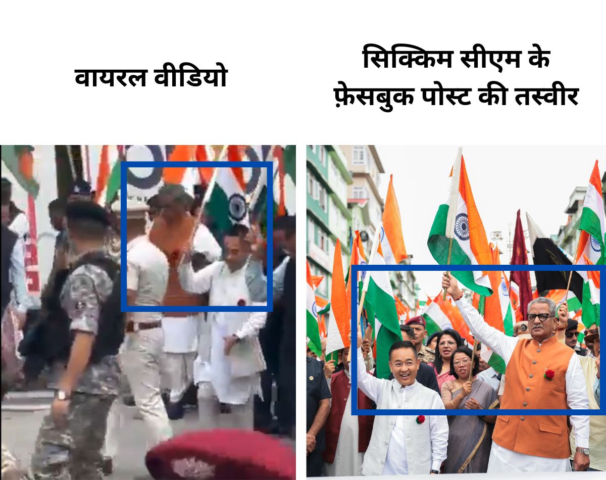 इसी रैली की तस्वीरें हमें मुख्यमंत्री प्रेम सिंह तमांग गोले के फ़ेसबुक पोस्ट पर भी मिलीं. इसमें उन्हें सफ़ेद कुरते-पजामे में देखा जा सकता है, जबकि राज्यपाल केसरिया बंडी में हैं.