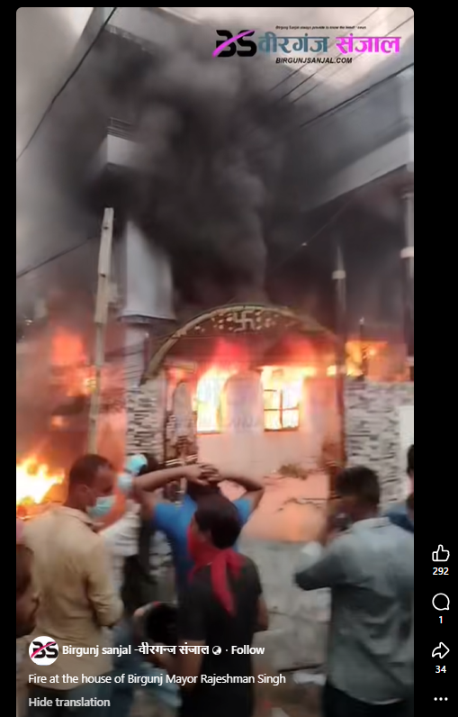 पहले दृश्य की पड़ताल में कीफ्रेम की मदद से रिवर्स इमेज सर्च करने पर हमें नेपाल के बीरगंज के एक मीडिया पोर्टल के फेसबुक अकाउंट पर 9 सितंबर 2025 को अपलोड किया गया वीडियो मिला. इसमें वायरल वीडियो से मिलते-जुलते दृश्य मौजूद थे. वीडियो के साथ मौजूद कैप्शन में बताया गया था कि प्रदर्शनकारियों ने बीरगंज के मेयर राजेश मान सिंह के घर में आग लगा दी थी.