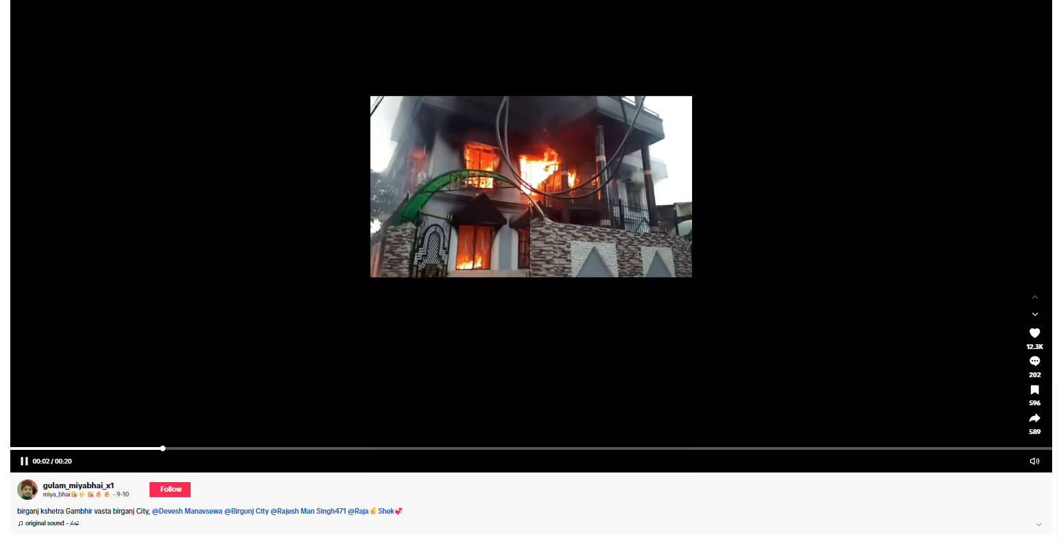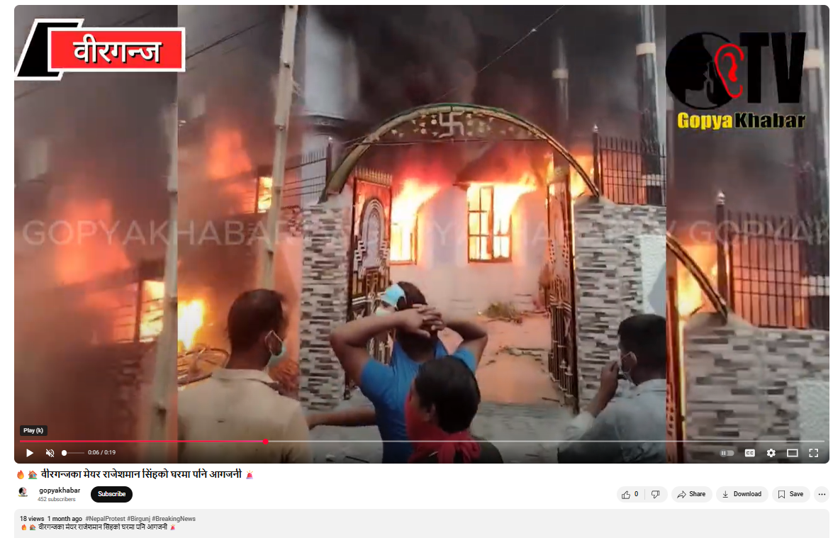 इसी दौरान हमें एक अन्य यूट्यूब अकाउंट पर भी 9 सितंबर 2025 को अपलोड किया गया वीडियो मिला, जिसमें वायरल वीडियो से मिलते-जुलते दृश्य मौजूद थे. इस वीडियो के साथ मौजूद कैप्शन में भी इसे बीरगंज के मेयर राजेश मान सिंह के घर में लगी आग का ही बताया गया था.