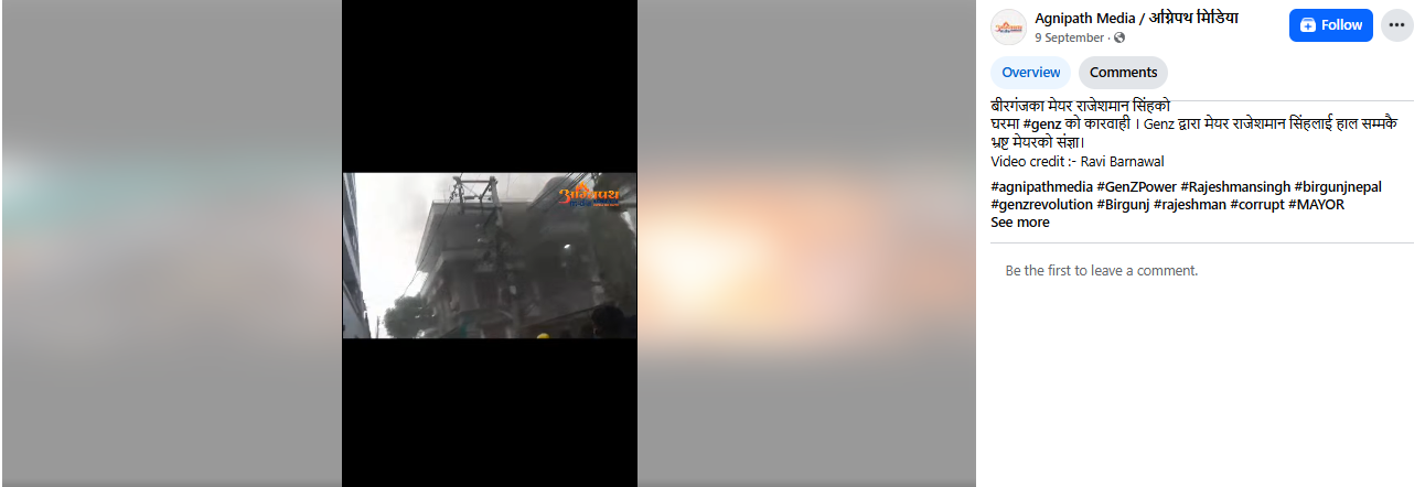 इस दृश्य की पड़ताल में हमें नेपाली मीडिया आउटलेट अग्निपथ के फेसबुक अकाउंट पर 9 सितंबर 2025 को अपलोड किया गया वीडियो मिला. वीडियो के साथ मौजूद कैप्शन में बताया गया था कि यह दृश्य जेन-जी प्रदर्शन के दौरान बीरगंज के मेयर राजेशमान सिंह के घर लगी आग के दौरान का है.
