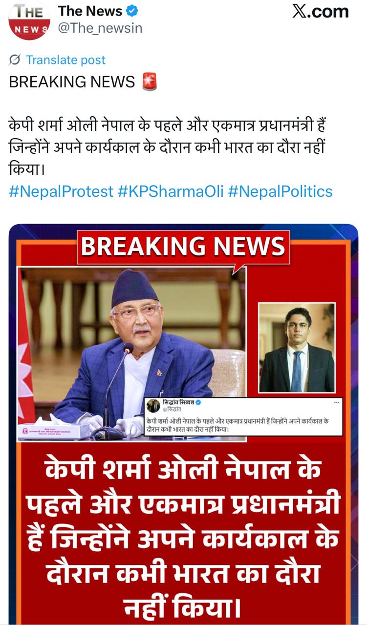 नेपाल में भ्रष्टाचार विरोधी हिंसक प्रदर्शनों के बीच प्रधानमंत्री केपी शर्मा ओली के इस्तीफ़े के बाद, सोशल मीडिया पर दावा किया जा रहा है कि केपी शर्मा ओली पहले और एकमात्र नेपाल के प्रधानमंत्री हैं, जिन्होंने अपने कार्यकाल के दौरान कभी भारत का दौरा नहीं किया.