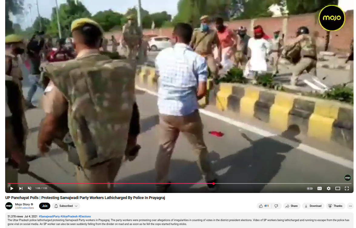 वीडियो के साथ मौजूद डिस्क्रिप्शन में बताया गया था कि उत्तर प्रदेश पुलिस ने प्रयागराज में प्रदर्शन कर रहे समाजवादी पार्टी के कार्यकर्ताओं पर लाठीचार्ज किया. दरअसल सपा कार्यकर्ता जिला पंचायत अध्यक्ष चुनाव में मतगणना में गड़बड़ी के आरोपों को लेकर विरोध कर रहे थे.