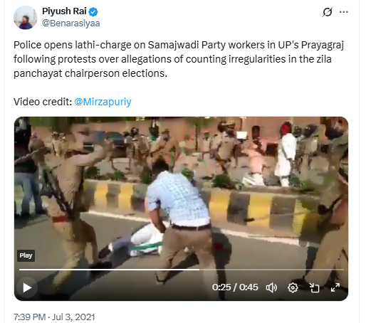 जांच में हमें उत्तर प्रदेश के पत्रकार पीयूष राय के X अकाउंट से भी 3 जुलाई 2021 को पोस्ट किया गया यह वीडियो मिला. वीडियो के साथ मौजूद कैप्शन में लिखा था, “उत्तर प्रदेश के प्रयागराज में जिला पंचायत अध्यक्ष चुनाव की मतगणना में गड़बड़ी के आरोपों को लेकर हुए प्रदर्शन के बाद पुलिस ने समाजवादी पार्टी कार्यकर्ताओं पर लाठीचार्ज किया”. हालांकि इस वीडियो का क्रेडिट उन्होंने एक स्वतंत्र पत्रकार बृजेंद्र दुबे को दिया था.