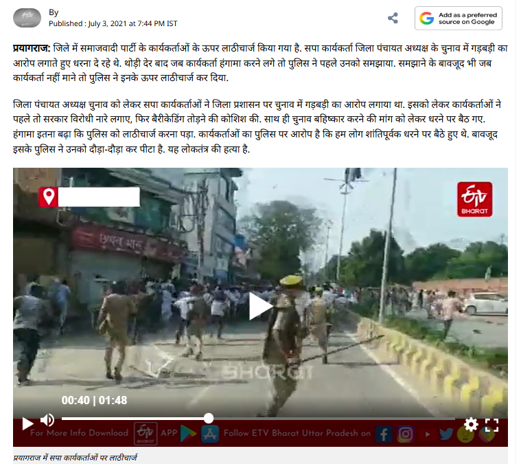 इसी दौरान हमें ईटीवी भारत की वेबसाइट पर प्रकाशित रिपोर्ट में भी वायरल वीडियो से जुड़े दृश्य अपलोड किए हुए मिले. इस रिपोर्ट में भी बताया गया था कि 3 जुलाई 2021 को पंचायत चुनाव के दौरान प्रयागराज में सपा कार्यकर्ता जिला पंचायत अध्यक्ष के चुनाव में गड़बड़ी का आरोप लगाकर धरना दे रहे थे. इस दौरान जब कार्यकर्ता हंगामा करने लगे तो पहले पुलिस ने समझाने की कोशिश की. लेकिन जब कार्यकर्ता नहीं माने तो पुलिस ने उन लोगों पर लाठीचार्ज किया. हालांकि कार्यकर्ताओं ने यह आरोप लगाया था कि शांतिपूर्वक धरना देने के बावजूद पुलिस ने उन पर लाठीचार्ज किया.