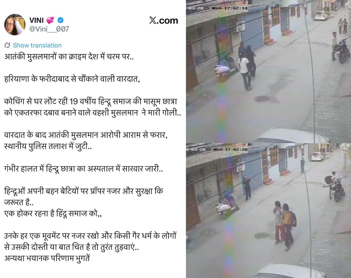 हरियाणा के फ़रीदाबाद में एक युवक द्वारा एक लड़की को दिनदहाड़े गोली मारने की घटना को सोशल मीडिया पर सांप्रदायिक रंग देकर शेयर किया जा रहा है. दावा किया जा रहा है कि इस घटना का आरोपी मुस्लिम है. घटना के सीसीटीवी फुटेज को शेयर करते हुए दावा किया जा रहा है कि फ़रीदाबाद में कोचिंग से घर लौट रही 19 वर्षीय हिंदू छात्रा को एक मुस्लिम युवक ने गोली मार दी.