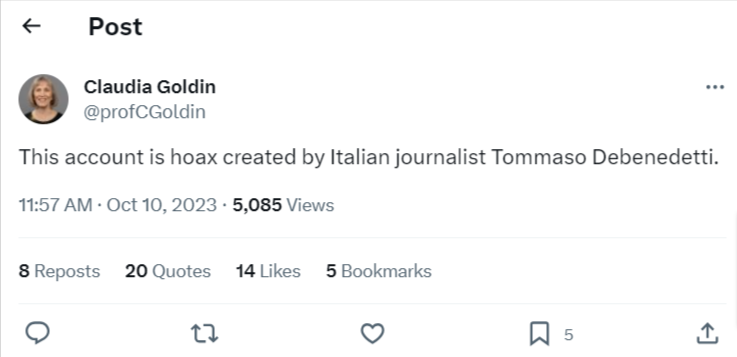 अपनी पड़ताल के दौरान हमने पाया कि नोबेल विजेता अमर्त्य सेन के निधन का दावा जिस X अकाउंट द्वारा किया गया था, वह असल में नोबेल विजेता Claudia Goldin के नाम पर बने एक फर्जी अकाउंट द्वारा शेयर किया गया था. उनका असल अकाउंट यहां देखा जा सकता है.