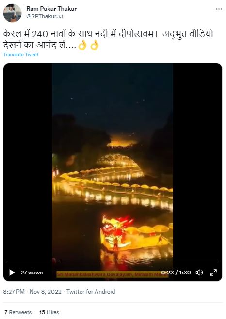 सोशल मीडिया पर दीपों से सजे नाव का एक वीडियो वायरल है। दावा किया जा रहा है कि ये वीडियो केरल का है, जहां हाल ही में 240 नावों के साथ नदी में दीपोत्सव मनाया गया।