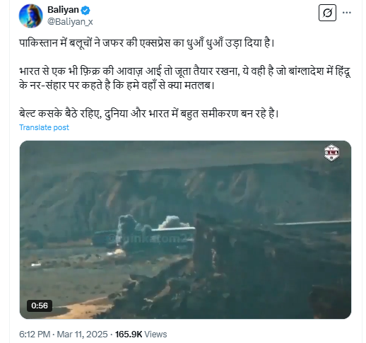 वीडियो को वायरल दावे वाले कैप्शन के साथ X पर शेयर किया गया है, जिसमें लिखा हुआ है “पाकिस्तान में बलूचों ने जफर की एक्सप्रेस का धुआँ धुआँ उड़ा दिया है”.