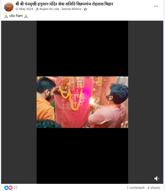 वीडियो में दिख रही जानकारी की मदद से फेसबुक पर सर्च करने पर हमें श्री पंचमुखी हनुमान मंदिर बिक्रमगंज रोहतास के नाम से बने फेसबुक अकाउंट पर 12 मई 2024 को अपलोड किए गए दो वीडियो मिले, जिनमें पवन सिंह मंदिर में पूजा अर्चना करते हुए दिखाई दे रहे हैं. इन दृश्यों में पवन सिंह उन्हीं कपड़ों में नजर आ रहे हैं, जो वायरल वीडियो में मौजूद है.