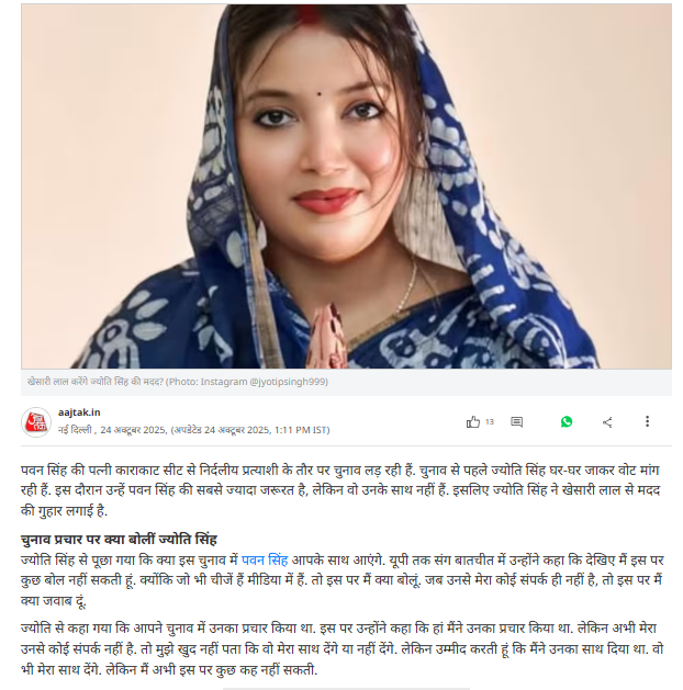 इस दौरान हमने वायरल दावे से जुड़ी रिपोर्ट भी खंगाली, लेकिन हमें ऐसी कोई रिपोर्ट नहीं मिली, जिसमें बताया गया हो कि पवन सिंह ज्योति सिंह का चुनाव प्रचार करने काराकाट गए हैं. खोजने पर हमें आजतक की वेबसाइट पर प्रकाशित एक रिपोर्ट मिली, जिसमें बताया गया था कि ज्योति सिंह ने पवन सिंह के चुनाव प्रचार में शामिल होने के सवाल पर कहा कि “मैंने उनका प्रचार किया था. लेकिन अभी मेरा उनसे कोई संपर्क नहीं है. तो मुझे खुद नहीं पता कि वो मेरा साथ देंगे या नहीं देंगे. लेकिन उम्मीद करती हूं कि मैंने उनका साथ दिया था. वो भी मेरा साथ देंगे. लेकिन मैं अभी इस पर कुछ कह नहीं सकती”.