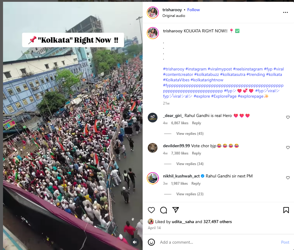 पीएम मोदी के मणिपुर दौरे के दौरान प्रदर्शन के दावे से वायरल इस वीडियो की पड़ताल में कीफ्रेम की मदद से रिवर्स इमेज सर्च करने पर हमें पश्चिम बंगाल की एक क्रिएटर त्रिशा रॉय के इंस्टाग्राम अकाउंट से 14 अप्रैल 2025 को अपलोड किया गया यह वीडियो मिला. वीडियो में उन्होंने इसे पश्चिम बंगाल की राजधानी कोलकाता का दृश्य बताया था. हालांकि इसमें नारेबाजी वाला वह ऑडियो मौजूद नहीं था, जो वायरल वीडियो में है.