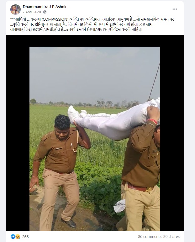| Claim Review: कोरोना काल में कंधे पर शव ले जाते पुलिसकर्मी की तस्वीर हुई वायरल। Claimed By: Viral post Fact Check: Misleading |