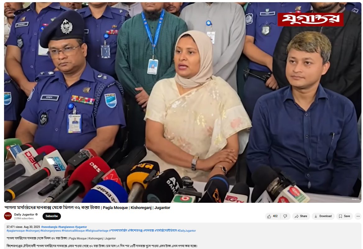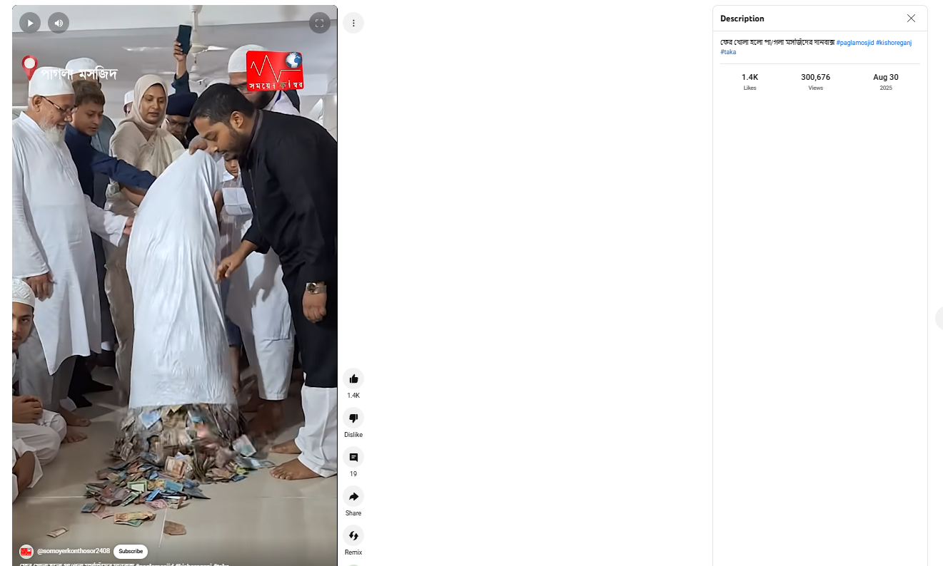 पंजाब के बाढ़ पीड़ित लोगों की मदद के लिए पैसे इकट्ठा करने के दावे से वायरल इस वीडियो की पड़ताल में हमें रिवर्स इमेज सर्च करने पर एक बांग्लादेशी यूट्यूब अकाउंट से 30 अगस्त 2025 को अपलोड किया गया यह वीडियो मिला. वीडियो के साथ मौजूद कैप्शन में लिखा हुआ था कि किशोरीगंज के पगला मस्जिद के डोनेशन बॉक्स को खोला गया.