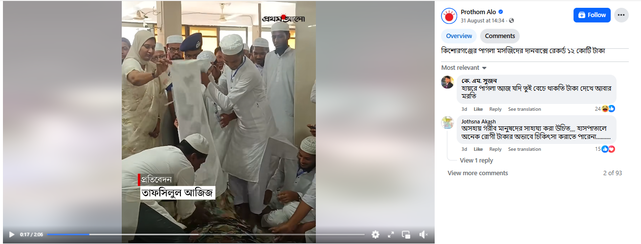 जांच में हमें बांग्लादेशी न्यूज आउटलेट प्रथम आलो के फेसबुक अकाउंट से भी इससे जुड़ा वीडियो अपलोड किया हुआ मिला. वीडियो के साथ मौजूद कैप्शन में इसे किशोरीगंज के पगला मस्जिद का ही बताया गया था.