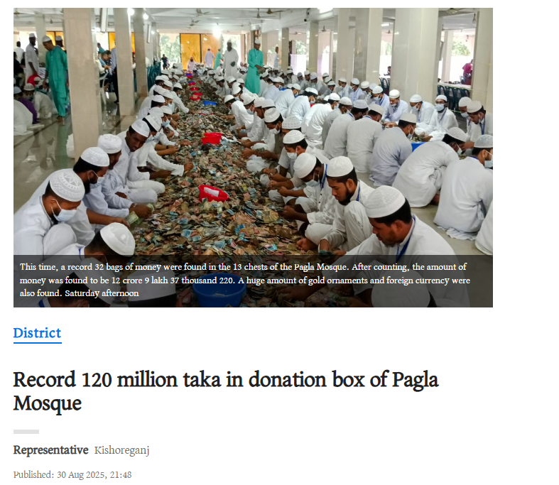 रिपोर्ट में बताया गया था कि 30 अगस्त को किशोरीगंज के पगला मस्जिद के डोनेशन बॉक्स को खोला गया था. डोनेशन बॉक्स को उपायुक्त एवं मस्जिद कमेटी की अध्यक्ष फौजिया खान, पुलिस अधीक्षक मोहम्मद हसन चौधरी और अतिरिक्त जिला मजिस्ट्रेट इर्शादुल अहमद की मौजूदगी में खोला गया था. इस दौरान उपायुक्त फौजिया खान ने कहा कि इन पैसों को बैंक में जमा कर दिया गया है और ये मस्जिद, मदरसा और स्वास्थ्य सुविधाओं से जुड़े कार्यों में खर्च किए जाएंगे.