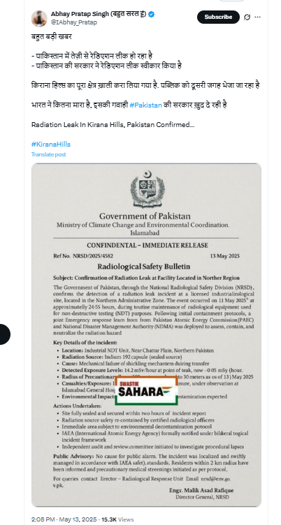 पाकिस्तान द्वारा जारी किये गए एक ऑफिसियल लेटर में इस बात की पुष्टि की गई है कि 11 मई 2025 को पाकिस्तान में रेडिएशन लीक हुआ था।