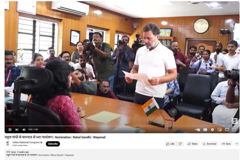 55 सेकेंड के इस वीडियो में राहुल गांधी नामांकन भरने के दौरान वायनाड की कलेक्टर डॉ रेनू राज के सामने अंग्रेज़ी में शपथ पत्र पढ़ते हुए कहते हैं, “I, Rahul Gandhi, having been nominated as a candidate to fill a seat in the house of the people do solemnly affirm that I will bear true faith and allegiance to the constitution of India as by law established and that I will uphold the sovereignty and integrity of the country”.
