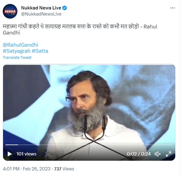 सोशल मीडिया पर कांग्रेस सांंसद राहुल गांधी के भाषण का एक वीडियो क्लिप वायरल है। दावा किया जा रहा है कि राहुल गांधी को सत्याग्रह का मतलब नहीं पता है। वीडियो में राहुल गांधी बोलते नज़र आ रहे हैं, “महात्मा गांधी कहते थे कि सत्याग्रह का मतलब सत्ता के रास्ते को कभी मत छोड़ो।” छत्तीसगढ़ बीजेपी के प्रवक्ता राजेश मूणत ने इस क्लिप को शेयर कर लिखा कि कांग्रेस का एक ही मंत्र है, सत्ता के रास्ते को कभी मत छोड़ना।