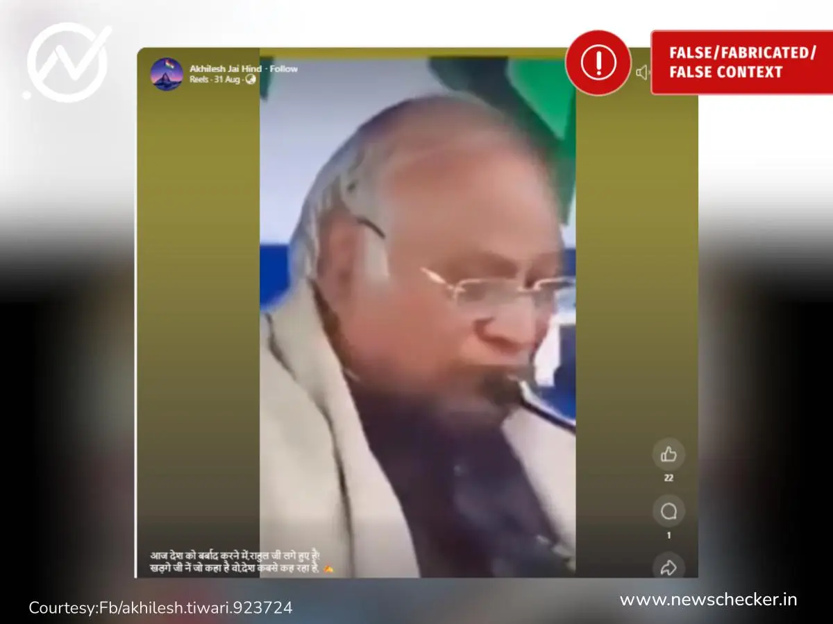 कई सोशल मीडिया यूजर्स ने एक वीडियो शेयर कर दावा किया कि कांग्रेस अध्यक्ष मल्लिकार्जुन खड़गे ने राहुल गांधी को ‘देश की बर्बादी’ का जिम्मेदार बताया है। हमारी पड़ताल में यह दावा फर्जी साबित हुआ। फैक्ट चेक यहां पढ़ा जा सकता है।