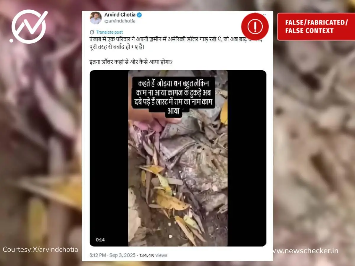 सोशल मीडिया यूजर्स ने एक वीडियो शेयर कर दावा किया कि पंजाब में एक परिवार ने जमीन में डॉलर गाड़ रखे थे, जो बाढ़ के बाद बर्बाद हो गए। हमारी पड़ताल में यह दावा गलत साबित हुआ। पूरी रिपोर्ट यहां पढ़ें।