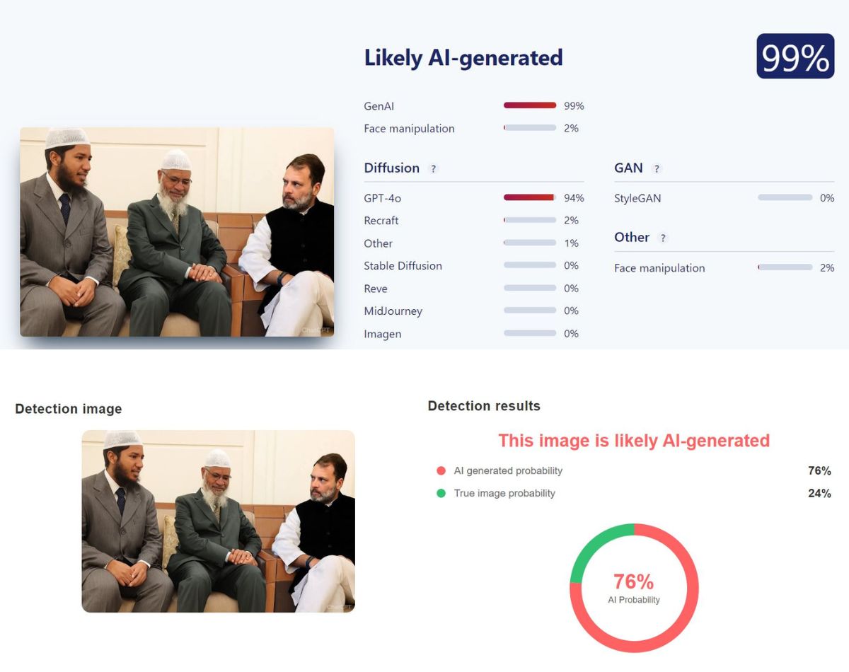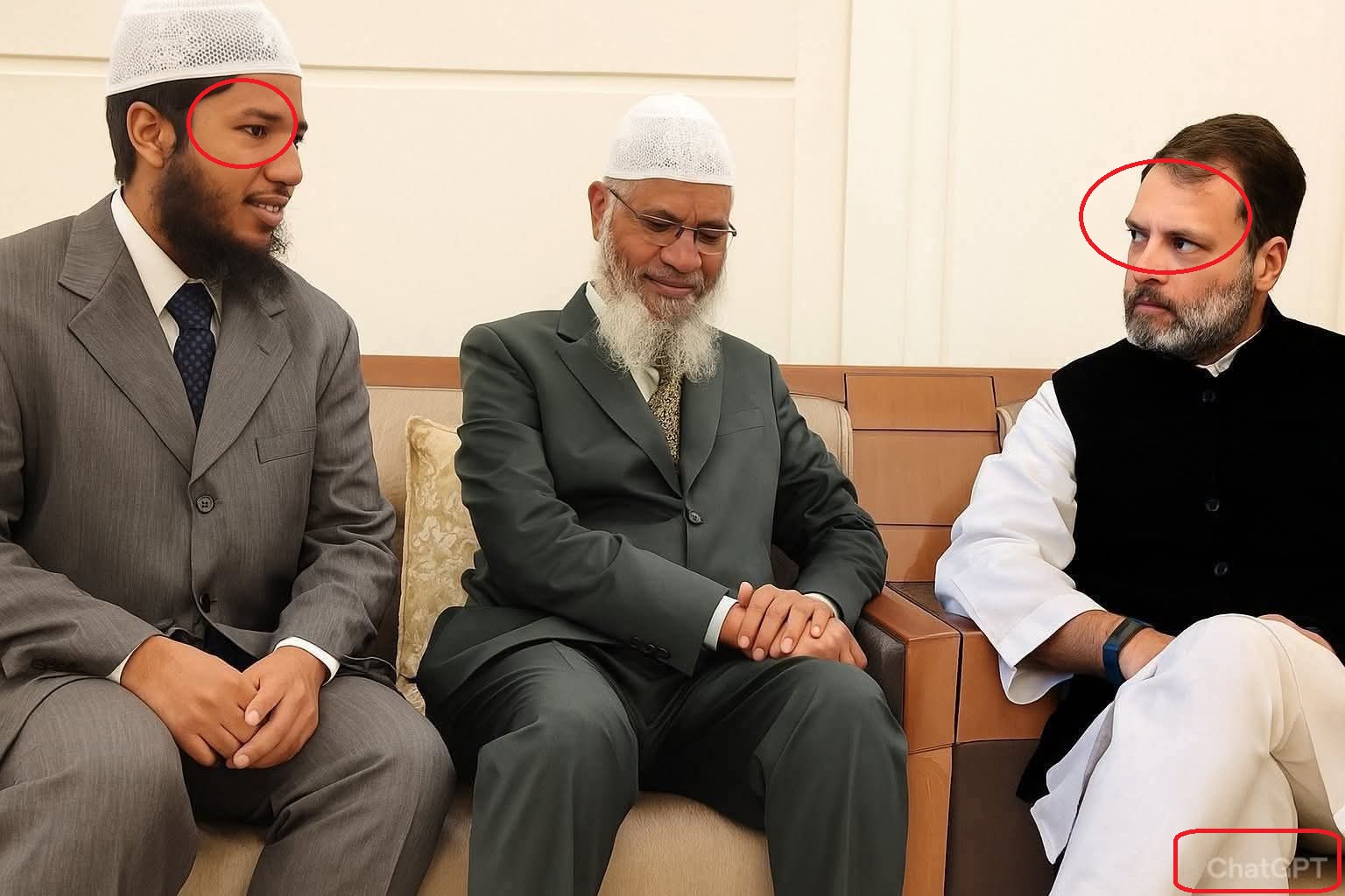 वायरल तस्वीर में नीचे दाईं ओर ‘ChatGPT’ लिखा हुआ दिखाई देता है, जो एआई टूल के इस्तेमाल का संकेत देता है. तस्वीर को ध्यान से देखने पर कुछ और विसंगतियां भी सामने आती हैं- जैसे राहुल गांधी की आंखें और माथा, ज़ाकिर नाइक की उंगली, और बगल में बैठे व्यक्ति की आंखों के आसपास का क्षेत्र. अमूमन इस तरह के इफ़ेक्ट अक्सर तब नज़र आते हैं, जब किसी असली तस्वीर में एआई की मदद से बदलाव किया गया हो.