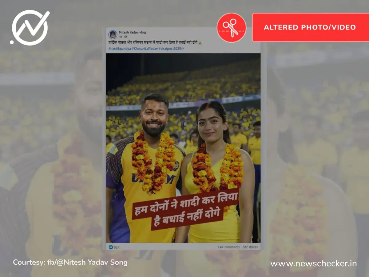 सोशल मीडिया पर एक तस्वीर के जरिए दावा किया गया कि क्रिकेटर हार्दिक पांड्या ने अभिनेत्री रश्मिका मंदाना से शादी कर ली है। हमारी पड़ताल में यह दावा फर्जी साबित हुआ। फैक्ट चेक यहां पढ़ें।