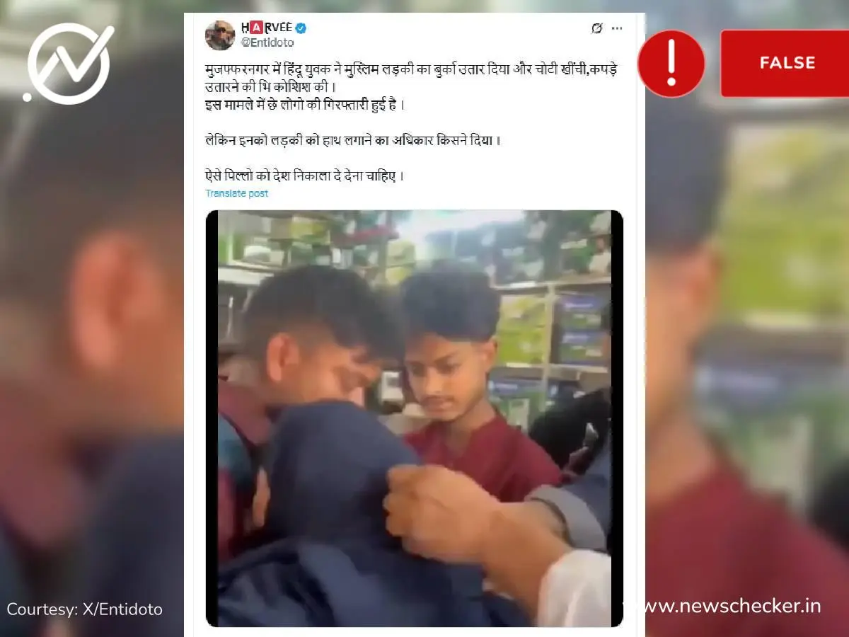 एक वीडियो को शेयर कर सोशल मीडिया यूजर्स ने दावा किया कि मुजफ्फरनगर में हिंदू युवक ने मुस्लिम लड़की का बुर्का उतार दिया। हमारी पड़ताल में यह दावा फर्जी साबित हुआ। फैक्ट चेक यहां पढ़ें।