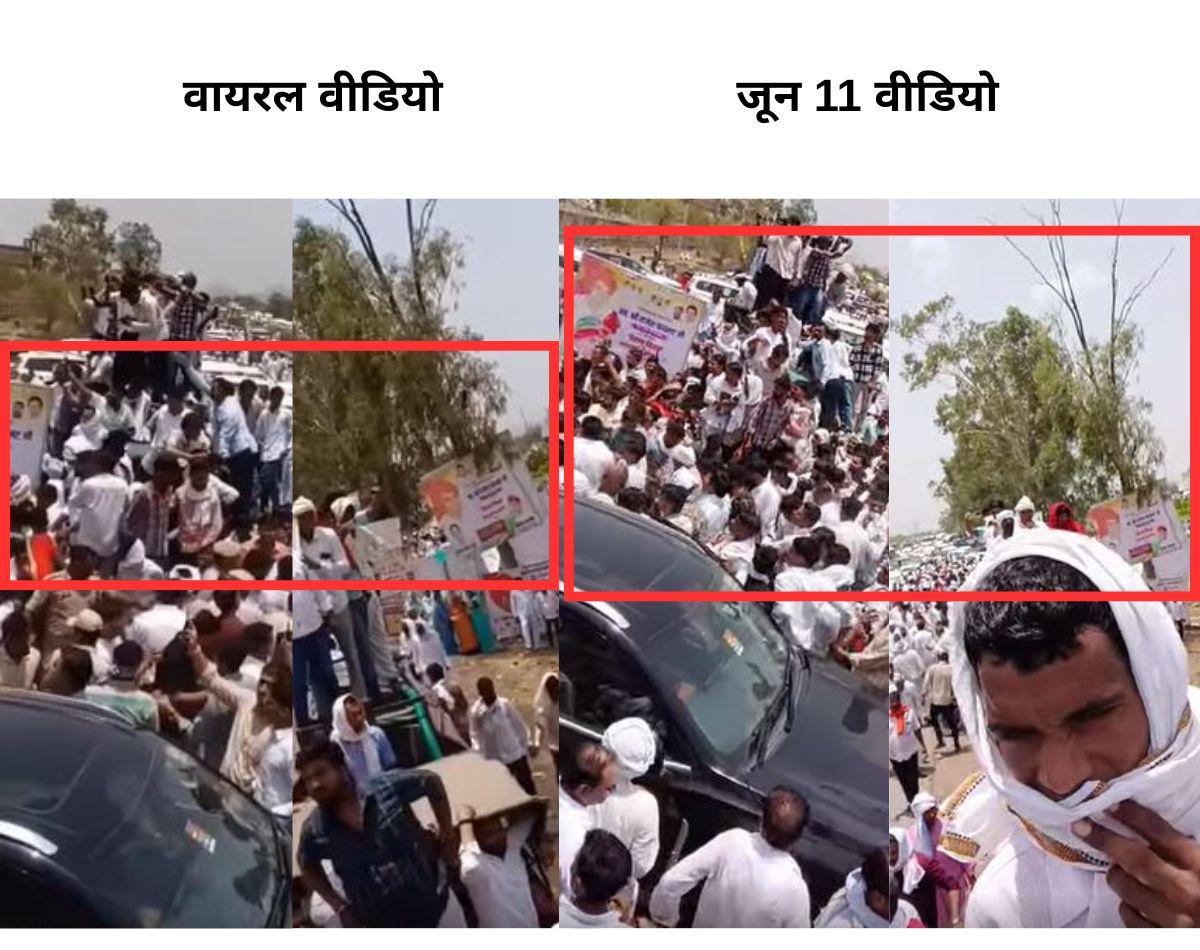 हमने वायरल वीडियो और 11 जून को पोस्ट किए गए वीडियोज़ के बीच तुलनात्मक विश्लेषण किया और कई समानताएं पाईं- जैसे: राजेश पायलट की तस्वीर वाले होर्डिंग्स, सड़क पर भीड़ में फंसी काले रंग की एसयूवी कार, और जाम में फंसे वाहन आदि.