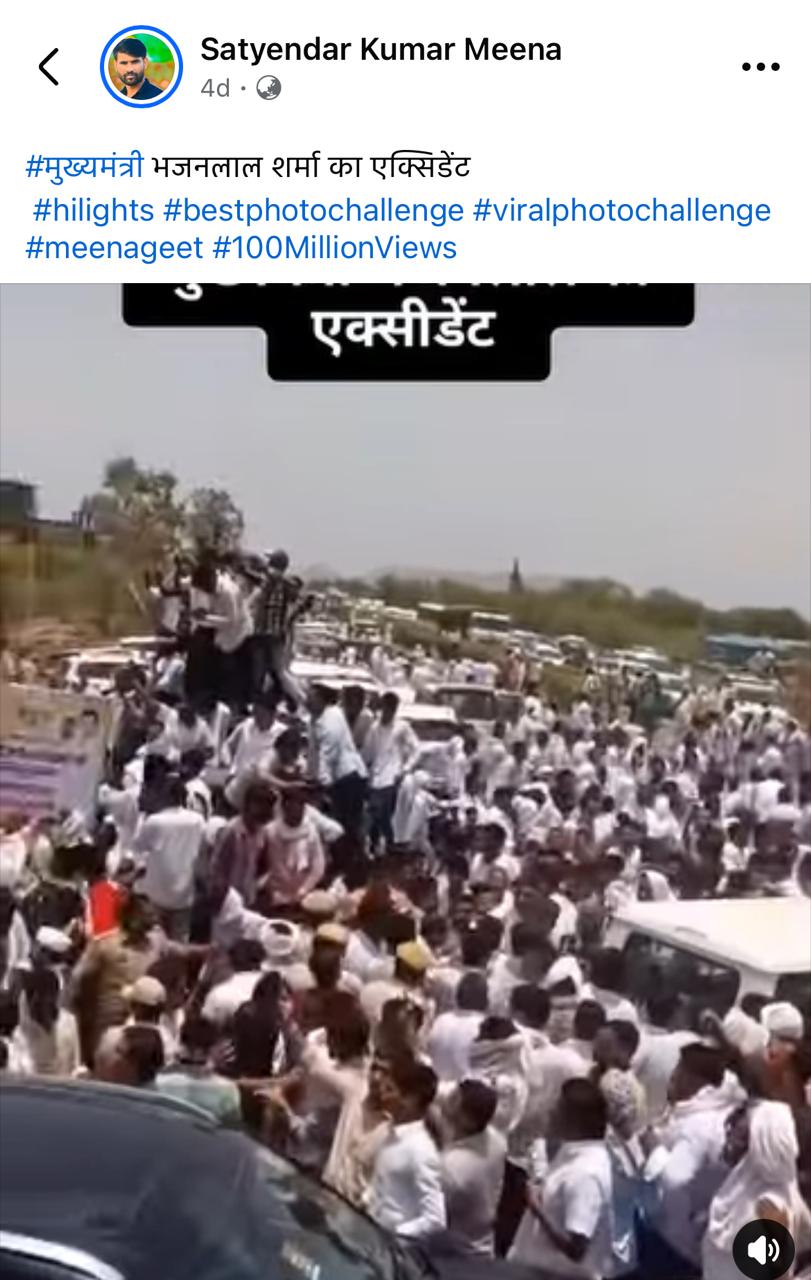 राजस्थान के मुख्यमंत्री भजनलाल शर्मा का एक्सीडेंट होने का दावा करते हुए एक वीडियो सोशल मीडिया पर शेयर किया जा रहा है. वीडियो में एक सड़क पर हजारों लोगों की भीड़ नज़र आ रही है.