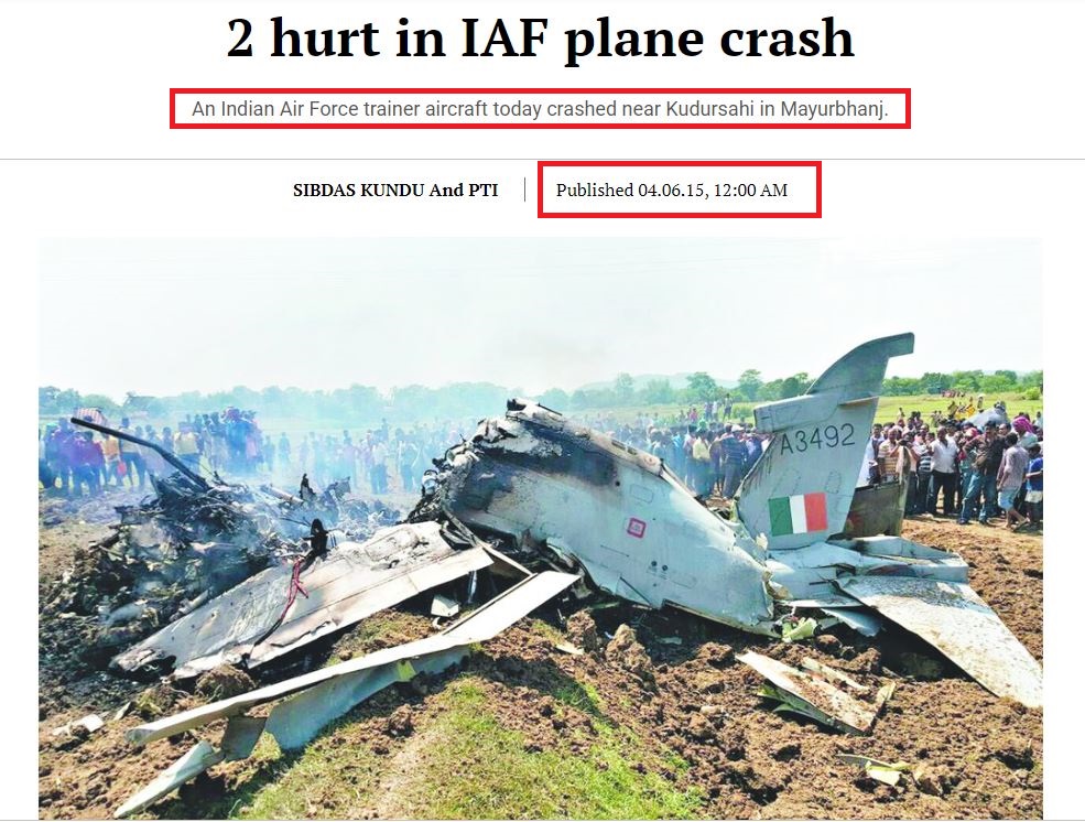 द टेलीग्राफ ऑनलाइन में 4 जून 2015 को प्रकाशित एक रिपोर्ट के मुताबिक़, 3 जून 2015 को ओडिशा के बारीपदा में एक एडवांस्ड ट्रेनर जेट एक रूटीन ट्रेनिंग उड़ान के दौरान क्रैश हो गया था. यह जेट कलाईकुंडा एयरबेस से उड़ा था और करीब 35 मिनट तक उड़ान भरते हुए लगभग 50 किलोमीटर की दूरी तय की थी. इस दौरान बीच हवा में तकनीकी ख़राब आ गई, जिससे यह विमान क्रैश हो गया. विमान की पहचान हॉक एडवांस्ड जेट ट्रेनर के रूप में हुई थी. हादसे से पहले दोनों पायलट सुरक्षित बाहर निकल गए थे, हालांकि उन्हें कुछ चोटें आई थीं.