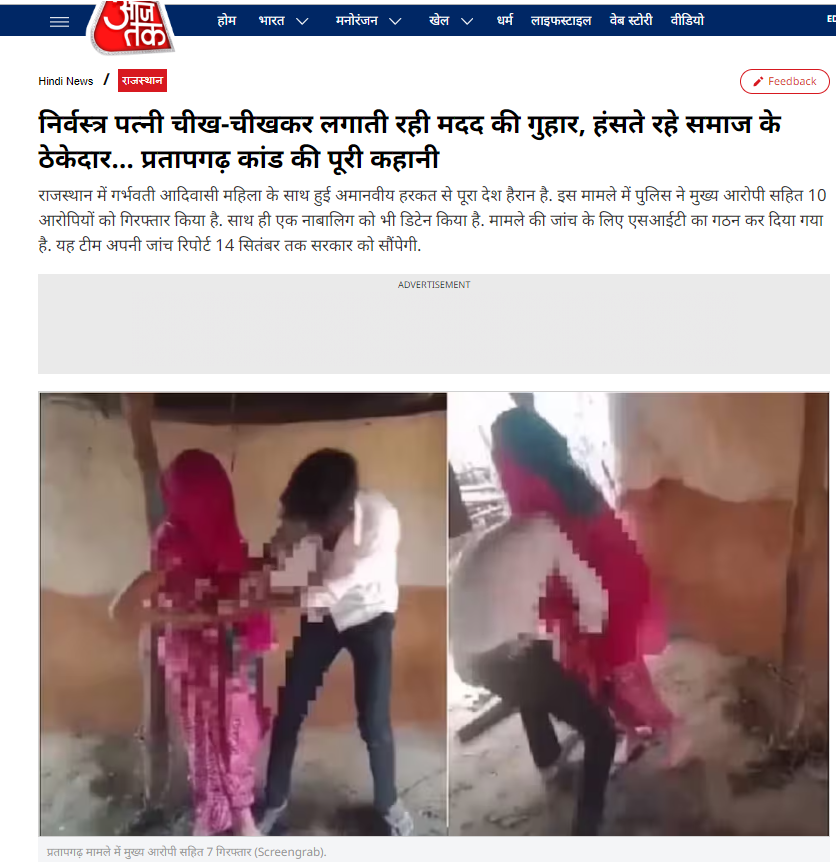 इस दौरान हमें मिली बीबीसी की वेबसाइट पर प्रकाशित रिपोर्ट में बताया गया था कि पुलिस ने इस मामले में आईपीसी की धारा 323, 341, 342, 354, 354 ख, 294, 365, 120, 504, 506, 498 ए, 509, महिलाओं का अश्लील प्रतिनिधित्व निषेध अधिनियम की धारा 4/6 और आईटी एक्ट की धारा 77ए के तहत एफआईआर दर्ज किया था. रिपोर्ट में पुलिस के हवाले से कुछ आदिवासियों में चलने वाली नाता प्रथा को घटना कारण बताया गया था.