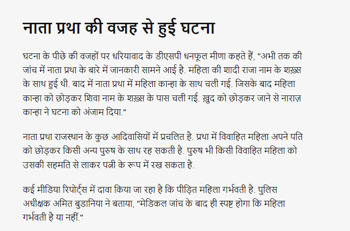 नाता प्रथा के अनुसार, आदिवासी महिला अपने पति को छोड़कर किसी अन्य पुरुष के साथ रह सकती है. वहीं पुरुष भी किसी अन्य विवाहित महिला को अपनी पत्नी के रूप में रख सकता है. पीड़िता की शादी सबसे पहले राजा नाम के शख्स से हुई थी. बाद में वह नाता प्रथा के अनुसार घटना के मुख्य आरोपी कान्हा के पास चली गई. बाद में महिला ने कान्हा को भी छोड़ दिया और शिवा नाम के व्यक्ति के पास चली गई. इसी से नाराज होकर कान्हा ने इस घटना को अंजाम दिया था.