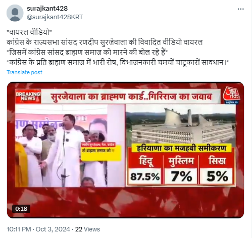 कांग्रेस सांसद रणदीप सुरजेवाला ने ब्राह्मण समाज को मारने का बयान दिया है। एक्स पोस्ट का आर्काइव यहाँ देखें।