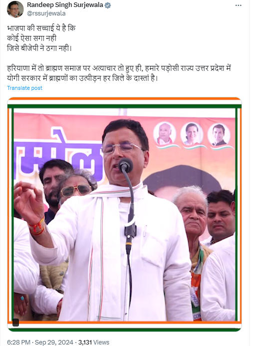 दावे की पड़ताल के लिए हमने वीडियो के की-फ्रेम्स को रिवर्स इमेज सर्च किया। इस दौरान हमें इस क्लिप का लंबा वर्जन रणदीप सुरजेवाला के आधिकारिक एक्स अकाउंट पर मिला। 29 सितंबर 2024 को किये गए एक्स पोस्ट (आर्काइव) के कैप्शन में लिखा है, “भाजपा की सच्चाई ये है कि कोई ऐसा सगा नही जिसे बीजेपी ने ठगा नही। हरियाणा में तो ब्राह्मण समाज पर अत्याचार तो हुए ही, हमारे पड़ोसी राज्य उत्तर प्रदेश में योगी सरकार में ब्राह्मणों का उत्पीड़न हर जिले के दास्तां है।”