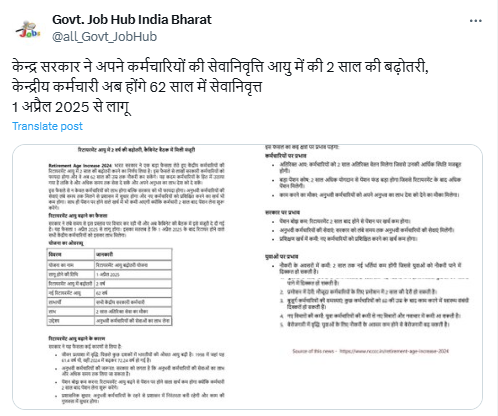 सोशल मीडिया पर वायरल हो रहे लेटर में लिखा हुआ है कि कैबिनेट बैठक में केंद्रीय कर्मचारियों की रिटायरमेंट आयु में 2 वर्ष की बढ़ोतरी को मंजूरी मिल गई है। लेटर में लिखा है कि यह फैसला 1 अप्रैल 2025 से लागू हो जायेगा। एक्स पोस्ट (आर्काइव) में लेटर को शेयर करते हुए कैप्शन में लिखा गया है कि “केन्द्र सरकार ने अपने कर्मचारियों की सेवानिवृत्ति आयु में की 2 साल की बढ़ोतरी, केन्द्रीय कर्मचारी अब होंगे 62 साल में सेवानिवृत्त 1 अप्रैल 2025 से लागू।”